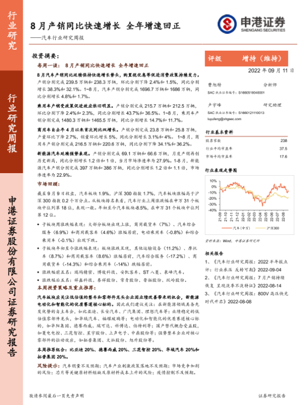 【申港证券】【20220911】20220911-申港证券-汽车行业研究周报:8月产销同比快速增长 全年增速回正-16页
