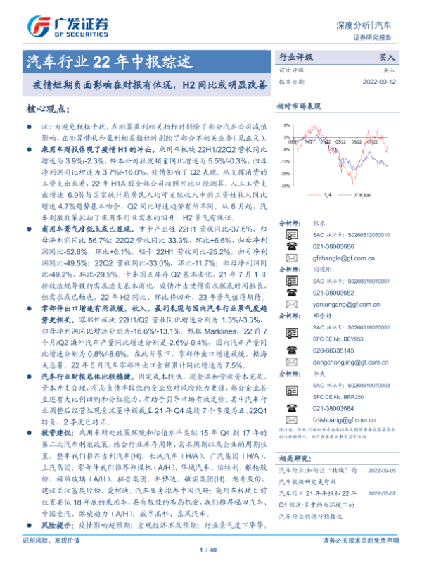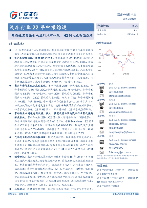 【广发证券】【20220912】汽车行业22年中报综述:疫情短期负面影响在财报有体现,H2同比或明显改善-40页