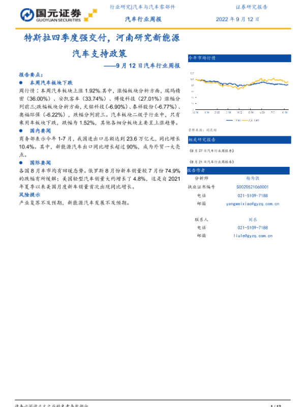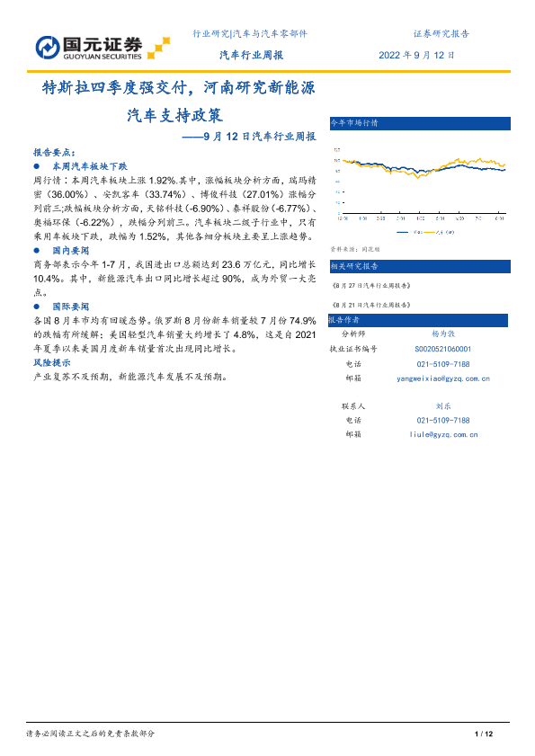 【国元证券】【20220912】20220912-国元证券-汽车行业周报:特斯拉四季度强交付,河南研究新能源汽车支持政策-12页