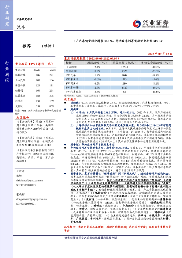 【兴业证券】【20220912】20220912-兴业证券-汽车行业周报:8月汽车销量同比增长32.1%,华为发布问界首款纯电车型M5EV-28页