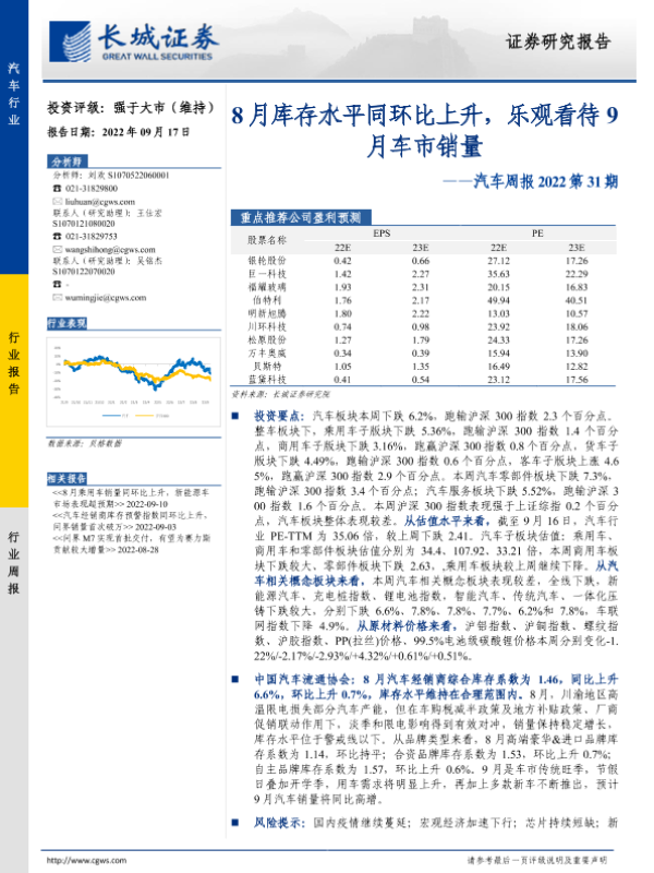【长城证券】【20220917】汽车周报2022第31期:8月库存水平同环比上升,乐观看待9月车市销量-12页