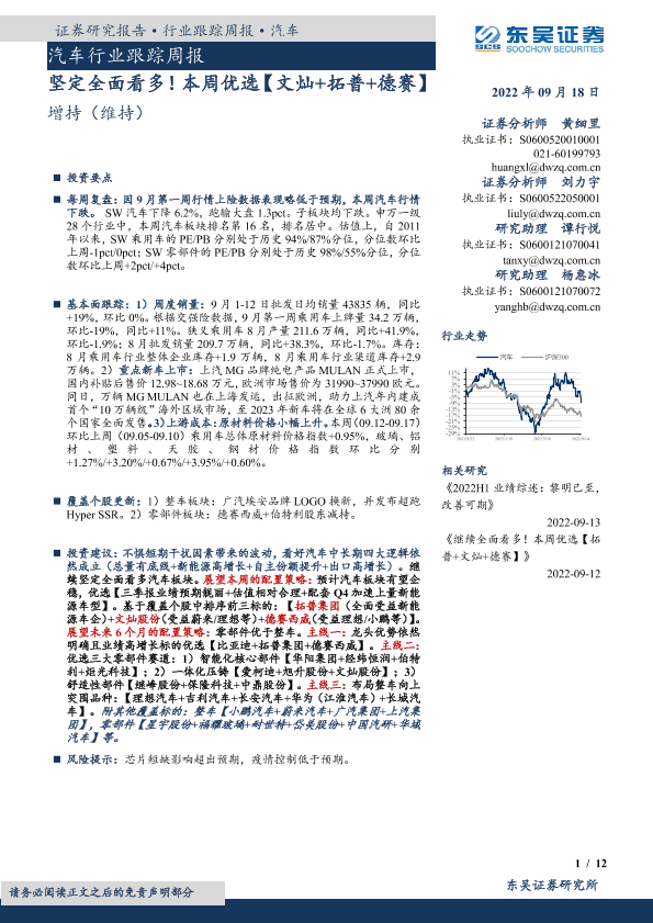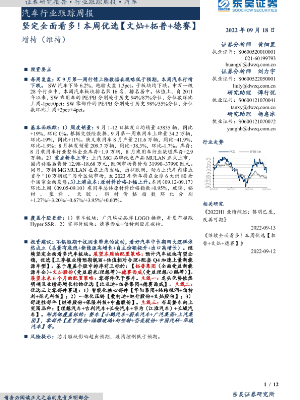 【东吴证券】【20220918】20220918-东吴证券-汽车行业跟踪周报:坚定全面看多!本周优选【文灿+拓普+德赛】-12页