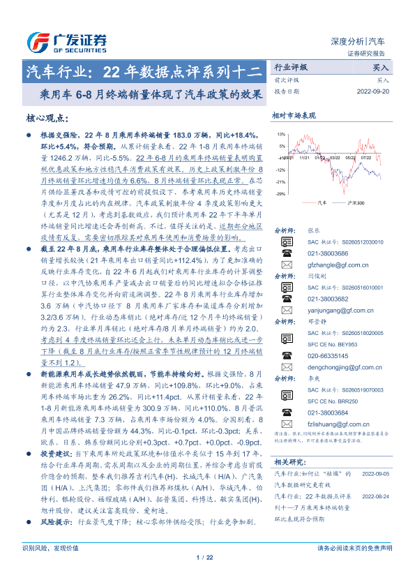 【广发证券】【20220920】汽车行业:22年数据点评系列十二:乘用车6-8月终端销量体现了汽车政策的效果-22页