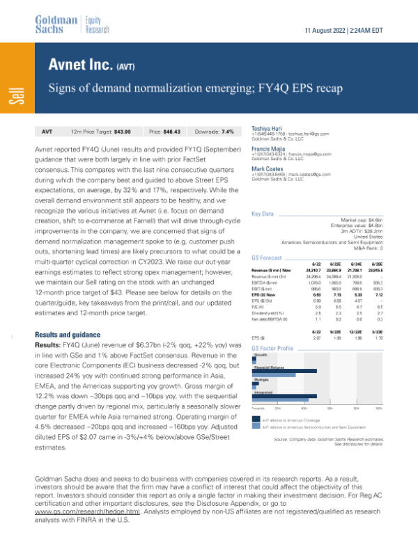 【Goldman Sachs】【20220811】Avnet Inc. (AVT) Signs of demand normalization emerging; FY4Q EPS recap-10页