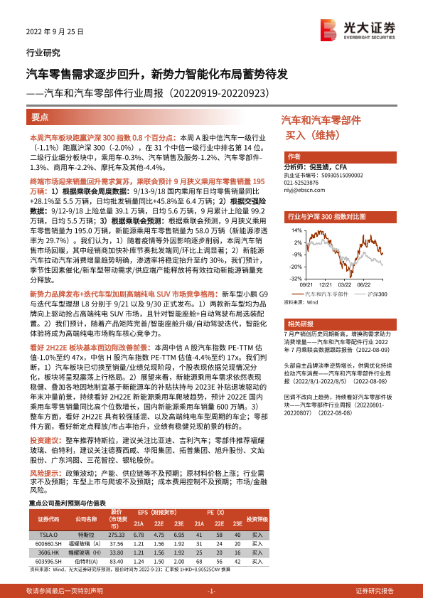 【光大证券】【20220925】汽车和汽车零部件行业周报:汽车零售需求逐步回升,新势力智能化布局蓄势待发-23页