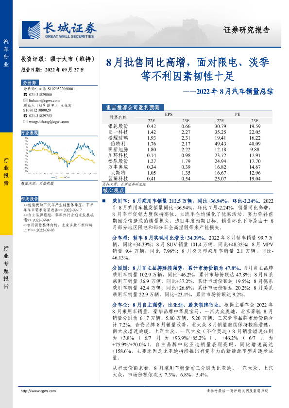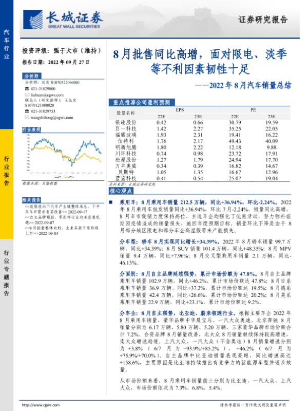 【长城证券】【20220927】2022年8月汽车销量总结-8月批售同比高增,面对限电、淡季等不利因素韧性十足-23页