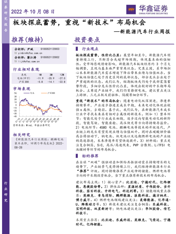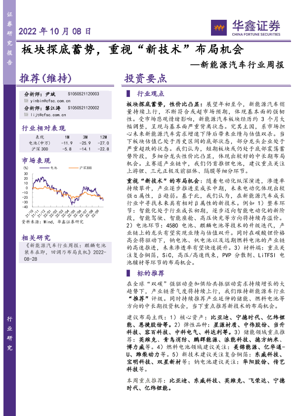【华鑫证券】【20221008】20221008-华鑫证券-新能源汽车行业周报:板块探底蓄势,重视“新技术”布局机会-17页