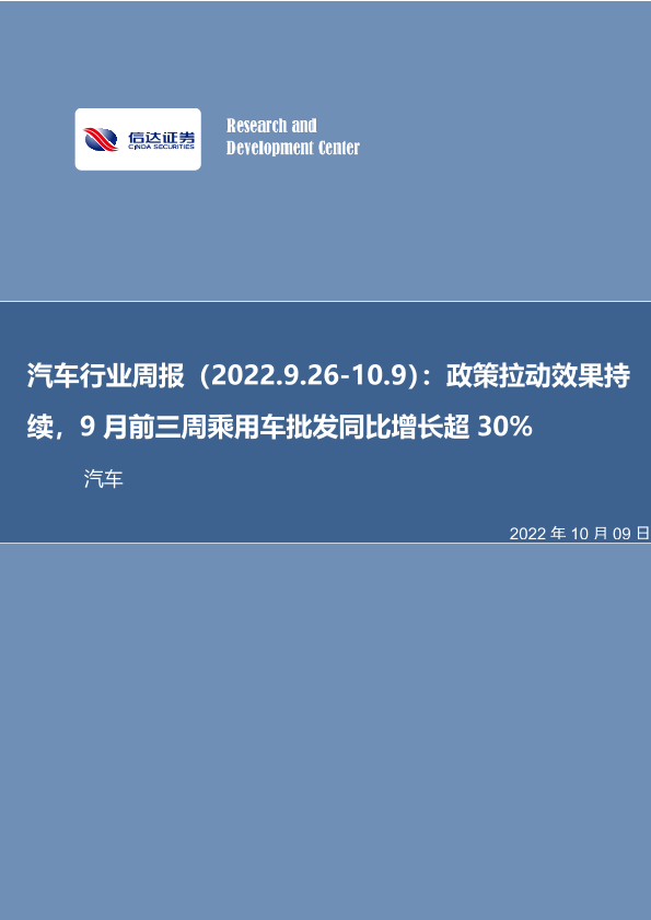 【信达证券】【20221009】20221009-信达证券-汽车行业周报:政策拉动效果持续,9月前三周乘用车批发同比增长超30%-21页