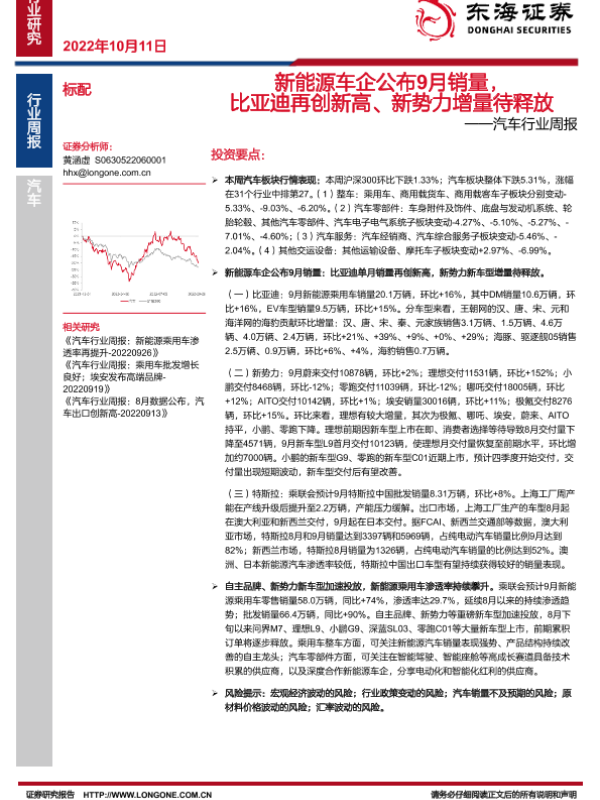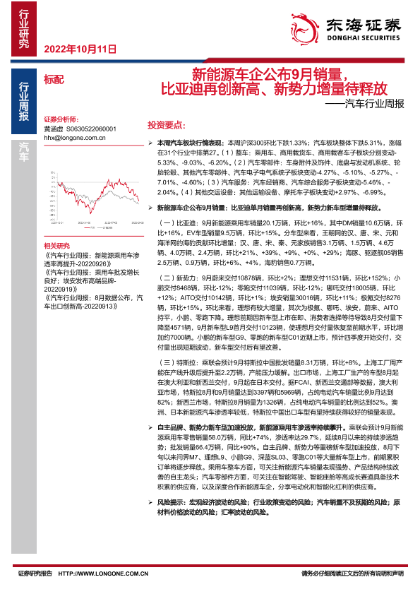 【东海证券】【20221011】汽车行业周报:新能源车企公布9月销量,比亚迪再创新高、新势力增量待释放-17页