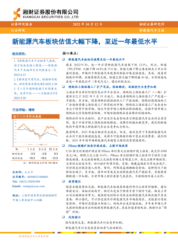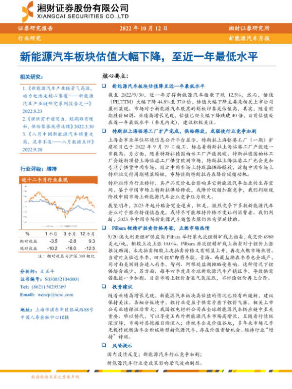 【湘财证券】【20221012】新能源汽车月报:新能源汽车板块估值大幅下降,至近一年最低水平-12页