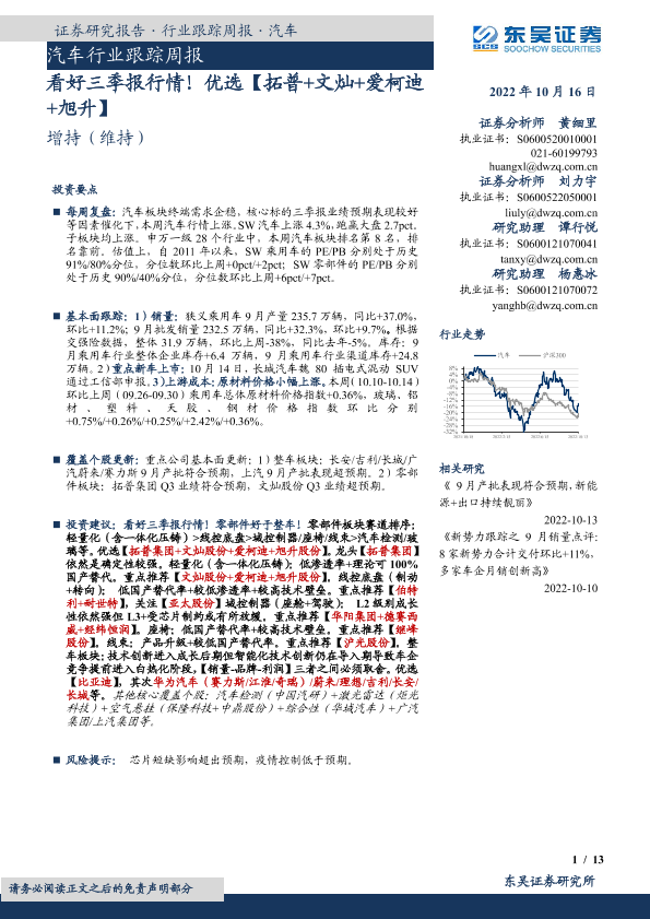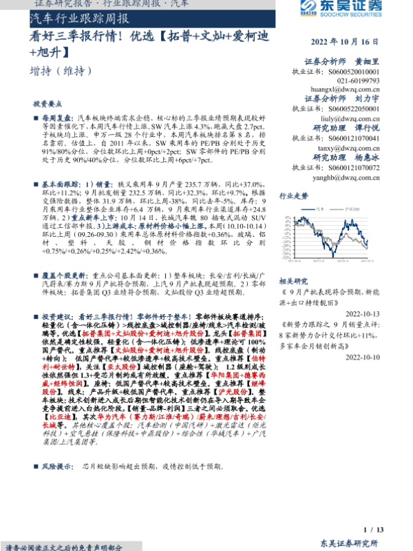 【东吴证券】【20221016】20221016-东吴证券-汽车行业跟踪周报:看好三季报行情!优选【拓普+文灿+爱柯迪+旭升】-13页
