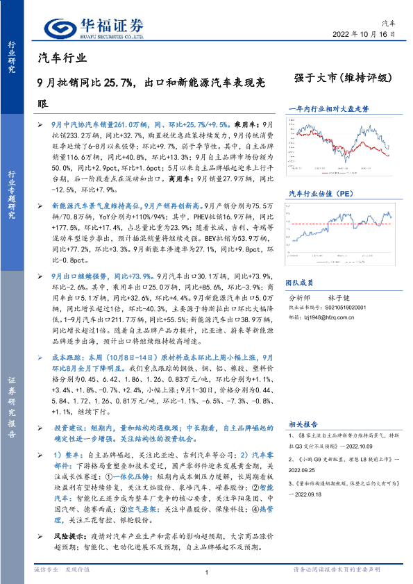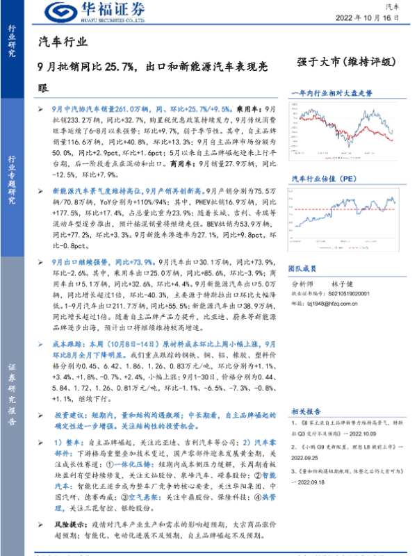 【华福证券】【20221016】20221016-华福证券-汽车行业:9月批销同比25.7%,出口和新能源汽车表现亮眼-10页