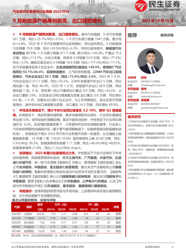 【民生证券】【20221016】汽车和汽车零部件行业周报:9月新能源产销再创新高,出口强势增长-24页