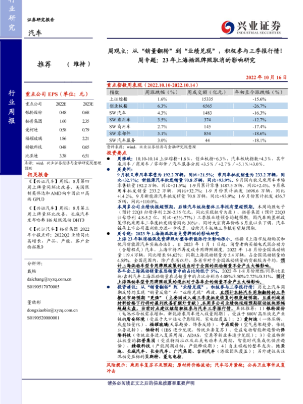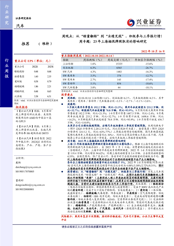 【兴业证券】【20221016】20221016-兴业证券-汽车周观点:从“销量翻转”到“业绩兑现”,积极参与三季报行情!周专题:23年上海插混牌照取消的影响研究-26页