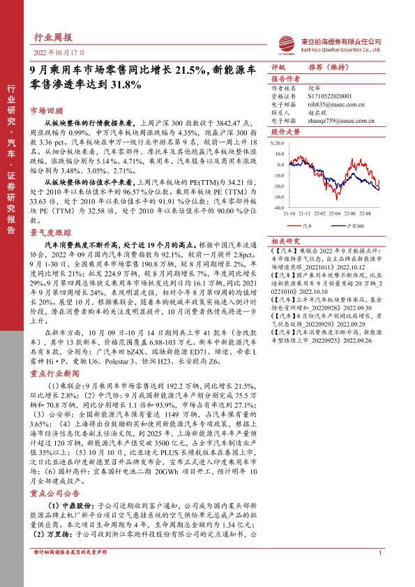 【东亚前海证券】【20221017】20221017-东亚前海证券-汽车行业周报:9月乘用车市场零售同比增长21.5%,新能源车零售渗透率达到31.8%-21页