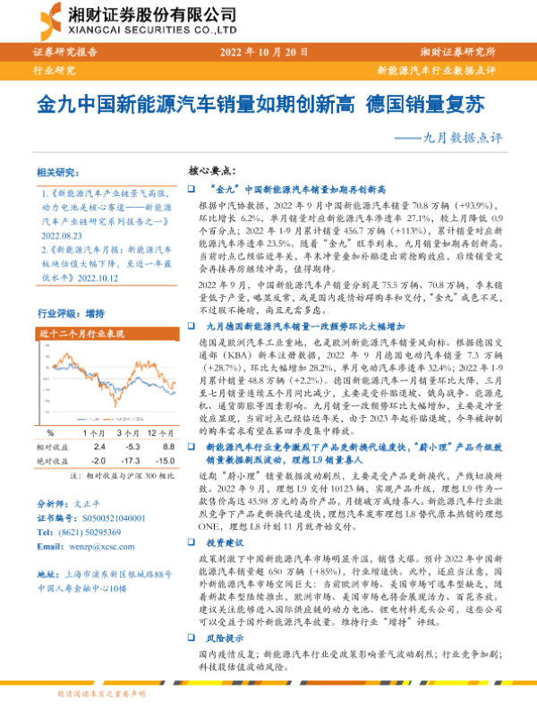 【湘财证券】【20221020】20221020-湘财证券-新能源汽车行业九月数据点评:金九中国新能源汽车销量如期创新高 德国销量复苏-16页