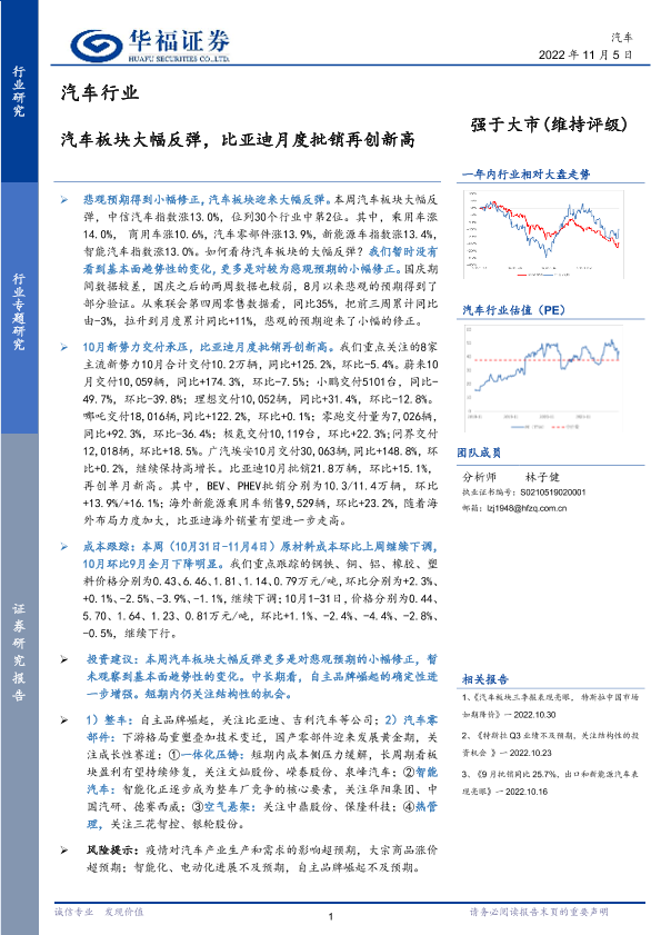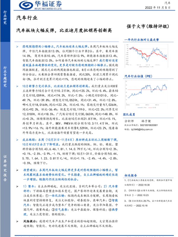 【华福证券】【20221106】汽车行业:汽车板块大幅反弹,比亚迪月度批销再创新高-10页