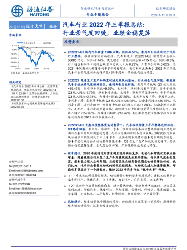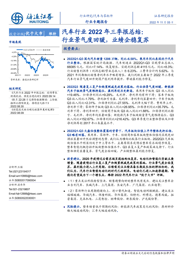 【海通证券】【20221105】汽车行业2022年三季报总结:行业景气度回暖,业绩企稳复苏-23页