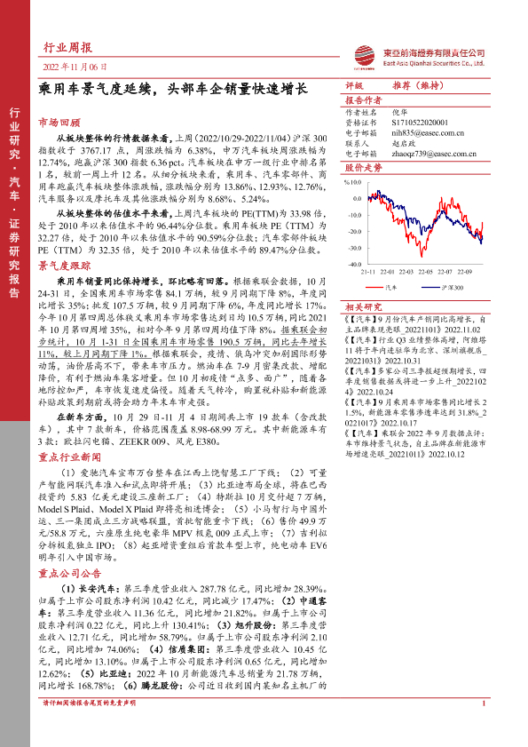 【东亚前海证券】【20221106】20221106-东亚前海证券-汽车行业周报:乘用车景气度延续,头部车企销量快速增长-19页