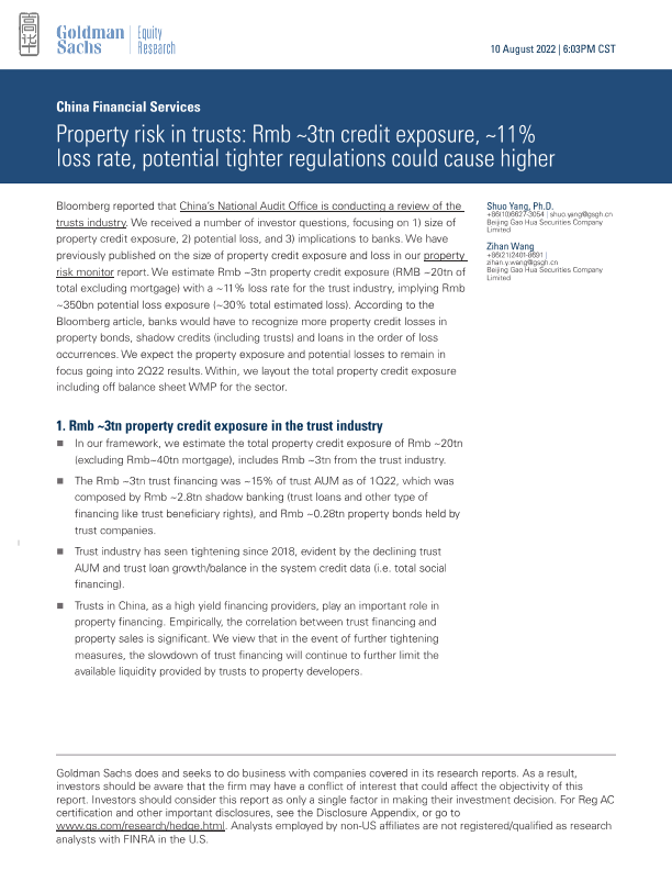 【Goldman Sachs】【20220810】中国信托行业的3万亿人民币房地产信用敞口、约11%的损失率及潜在更严格的法规-12页