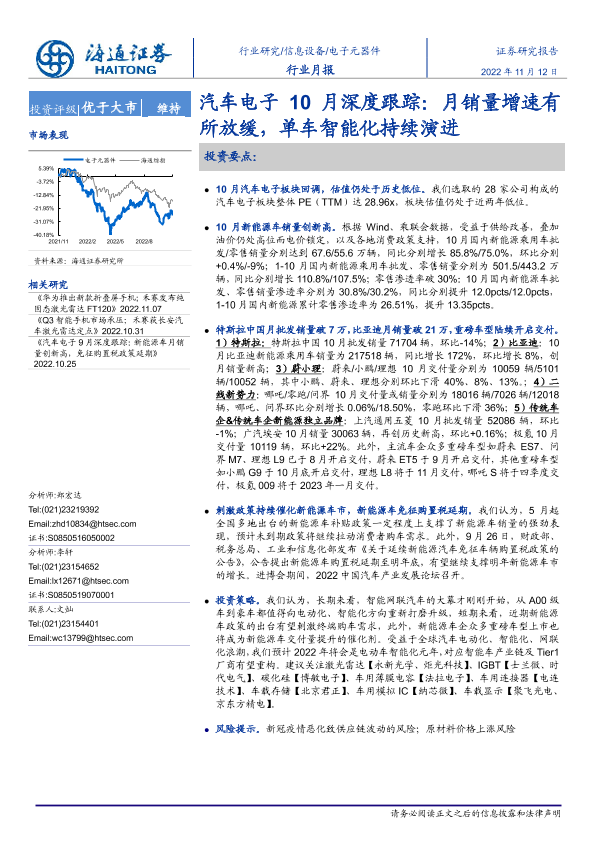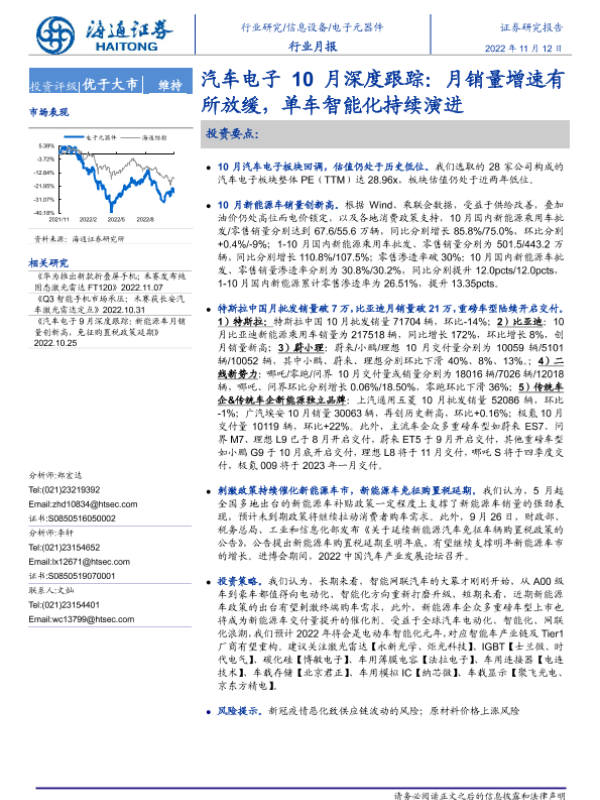 【海通证券】【20221112】汽车电子10月深度跟踪:月销量增速有所放缓,单车智能化持续演进-17页