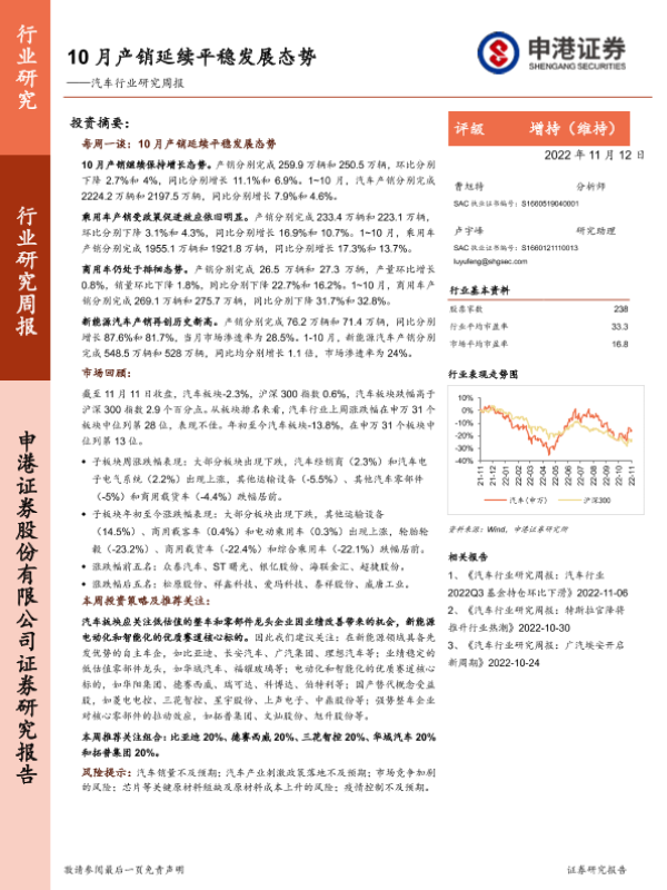 【申港证券】【20221112】10月产销延续平稳发展态势——汽车行业研究周报-16页