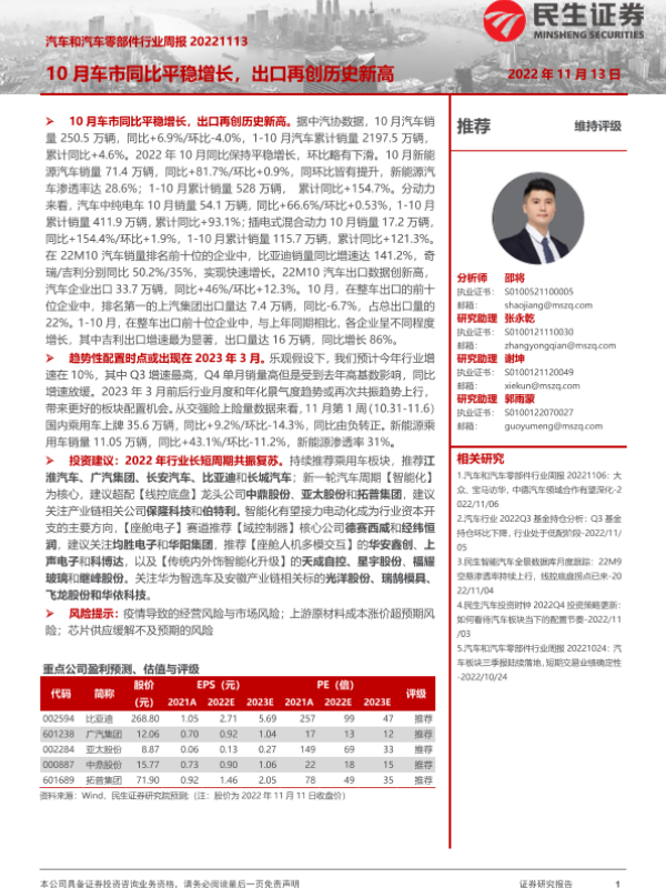 【民生证券】【20221113】汽车和汽车零部件行业周报:10月车市同比平稳增长,出口再创历史新高-19页