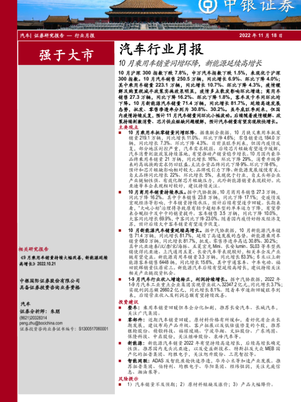 【中银证券】【20221118】20221118-中银证券-汽车行业月报:10月乘用车销量同增环降,新能源延续高增长-16页