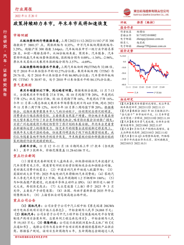 【东亚前海证券】【20221120】20221120-东亚前海证券-汽车行业周报:政策持续助力车市,年末车市或将加速恢复-19页