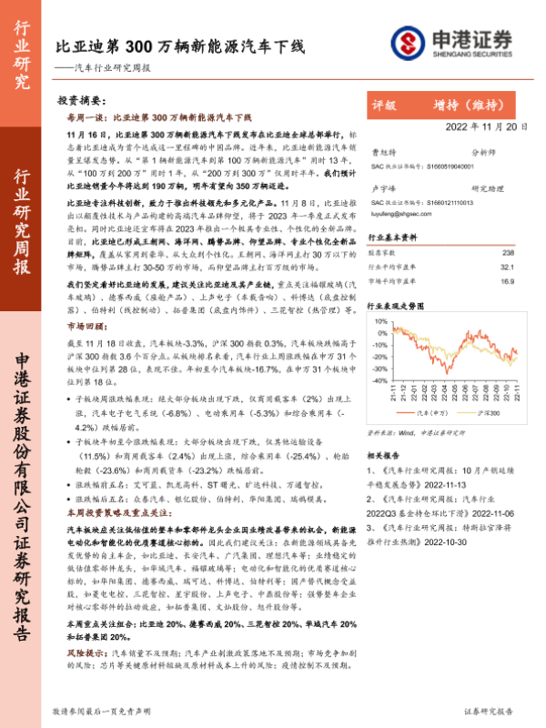 【申港证券】【20221120】汽车行业研究周报:比亚迪第300万辆新能源汽车下线-14页