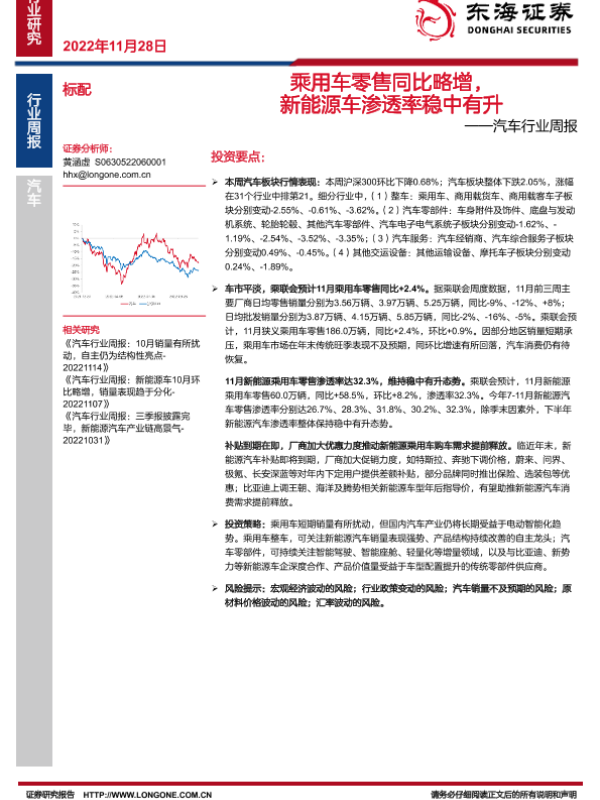 【东海证券】【20221128】20221128-东海证券-汽车行业周报:乘用车零售同比略增,新能源车渗透率稳中有升-14页
