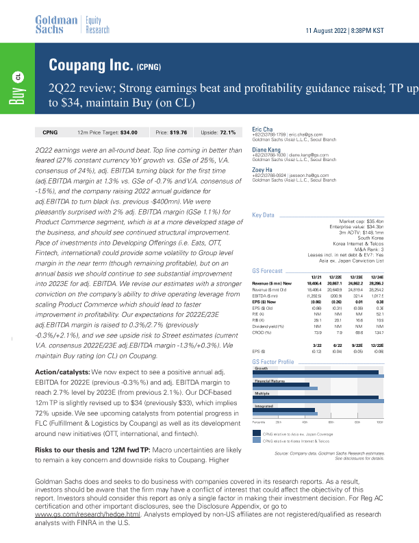 【Goldman Sachs】【20220811】Coupang 2Q22业绩超预期及盈利能力指引上调;目标价上调至34美元,维持买入评级-13页