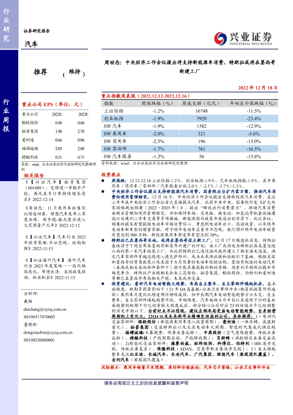 【兴业证券】【20221218】汽车周动态:中央经济工作会议提出将支持新能源车消费,特斯拉或将在墨西哥新建工厂-24页