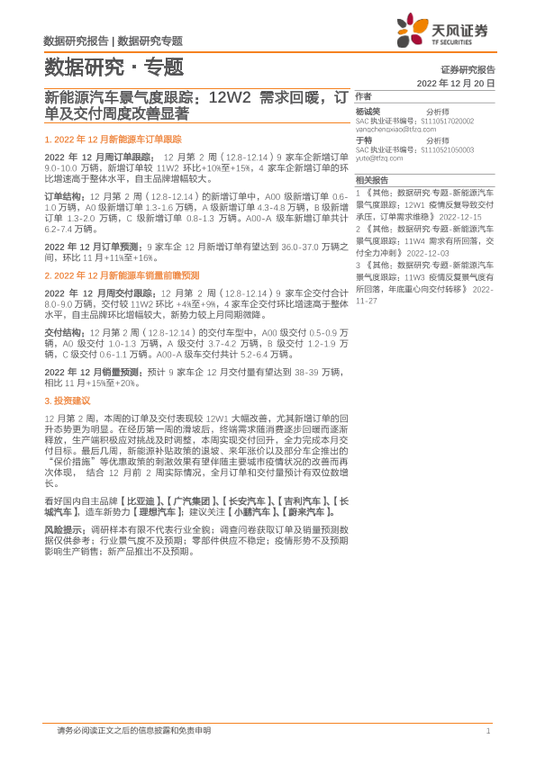 【天风证券】【20221220】新能源汽车景气度跟踪:12W2需求回暖,订单及交付周度改善显著-13页