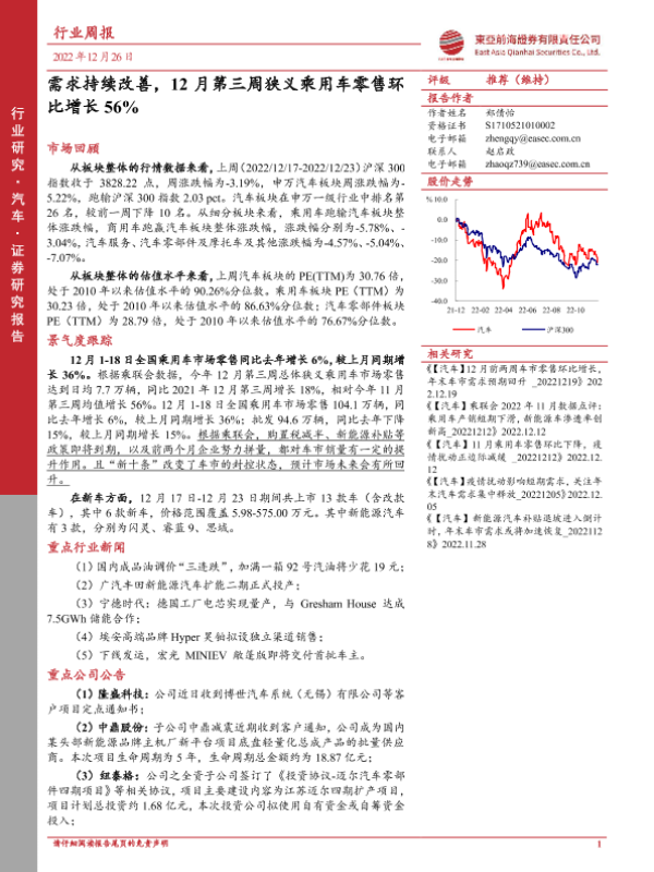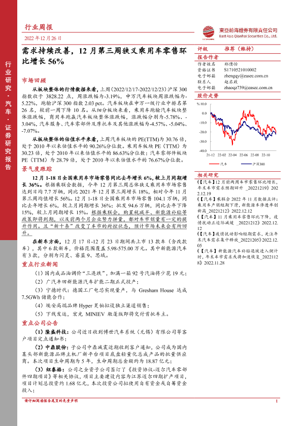 【东亚前海证券】【20221226】20221226-东亚前海证券-汽车行业周报:需求持续改善,12月第三周狭义乘用车零售环比增长56%-18页