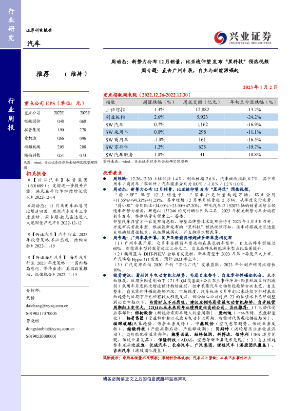 【兴业证券】【20230102】汽车周动态:新势力公布12月销量,比亚迪仰望发布“黑科技”预热视频-周专题:直击广州车展,自主与新能源崛起-28页