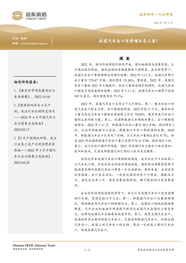 【远东资信】【20230111】我国汽车出口逆势增长怎么看?-11页