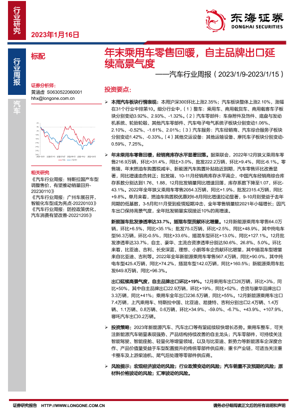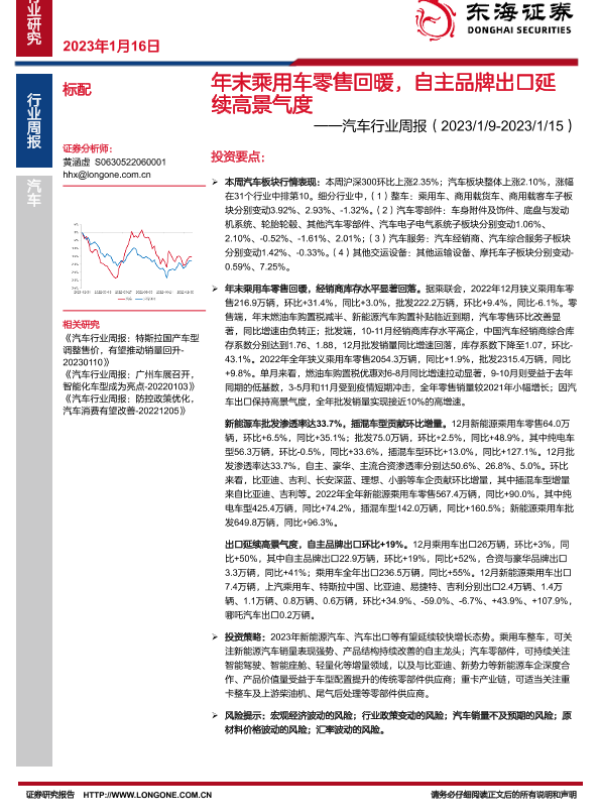 【东海证券】【20230116】年末乘用车零售回暖,自主品牌出口延续高景气度-17页