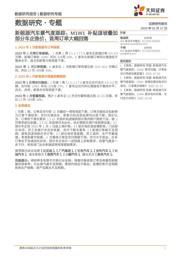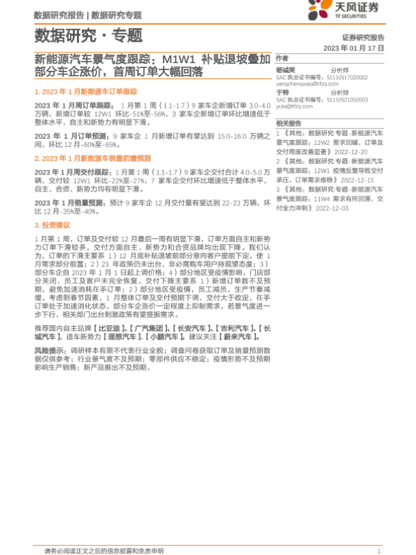 【天风证券】【20230117】新能源汽车景气度跟踪:M1W1补贴退坡叠加部分车企涨价,首周订单大幅回落-11页