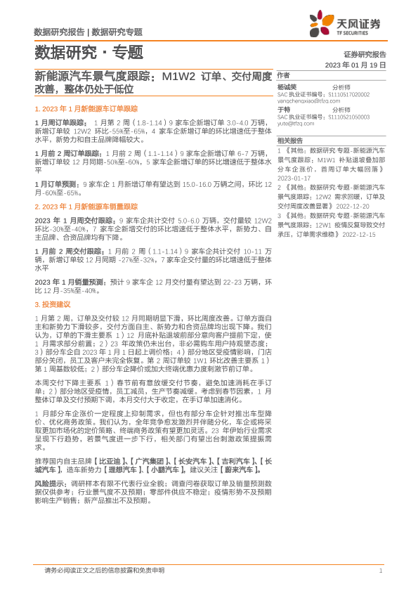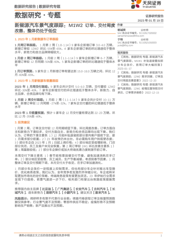 【天风证券】【20230119】20230119-天风证券-新能源汽车景气度跟踪:M1W2订单、交付周度改善,整体仍处于低位-12页