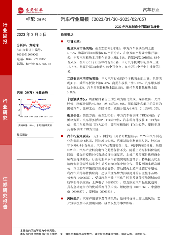 【东莞证券】【20230205】20230205-东莞证券-汽车行业周报:2022年汽车制造业利润略有增长-12页