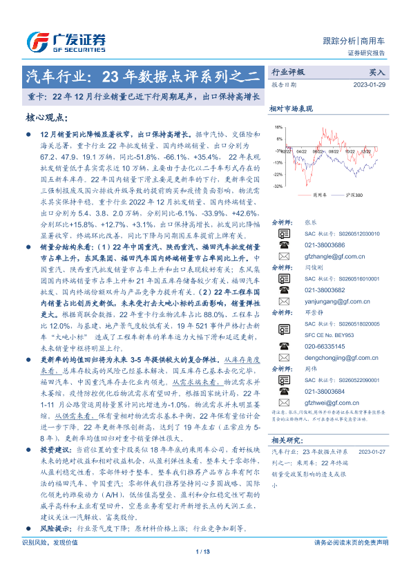 【广发证券】【20230129】汽车行业:23年数据点评系列之二:重卡:22年12月行业销量已近下行周期尾声,出口保持高增长-13页