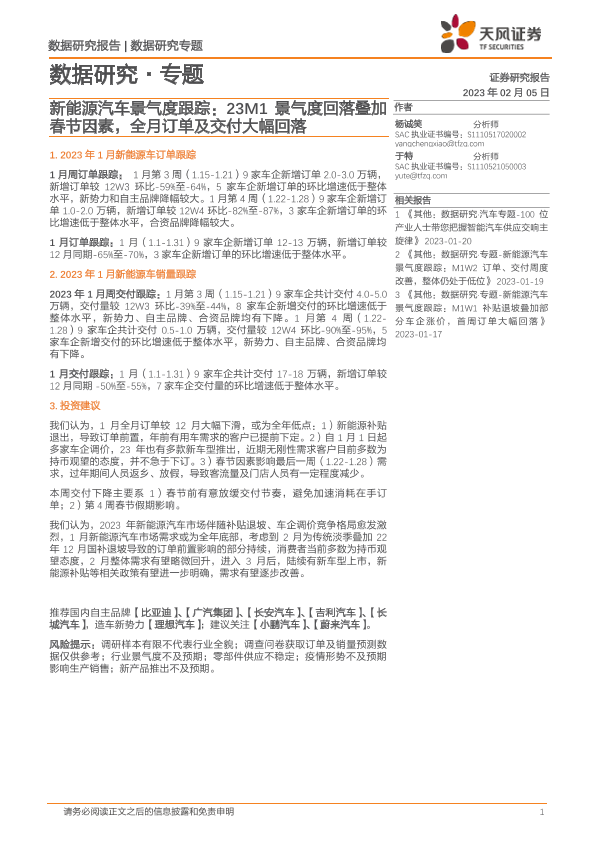 【天风证券】【20230205】新能源汽车景气度跟踪:23M1景气度回落叠加春节因素,全月订单及交付大幅回落-11页