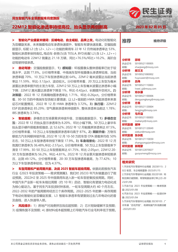 【民生证券】【20230205】民生智能汽车全景数据库月度跟踪:22M12智能化渗透率持续高位,抬头显示再创新高-17页