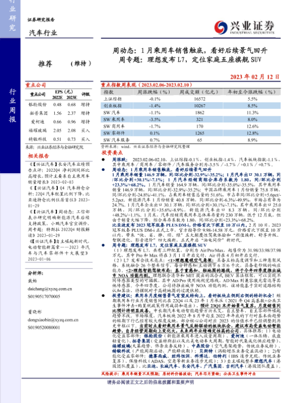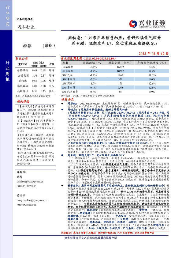 【兴业证券】【20230212】20230212-兴业证券-汽车行业周动态:1月乘用车销售触底,看好后续景气回升 周专题:理想发布L7,定位家庭五座旗舰SUV-28页