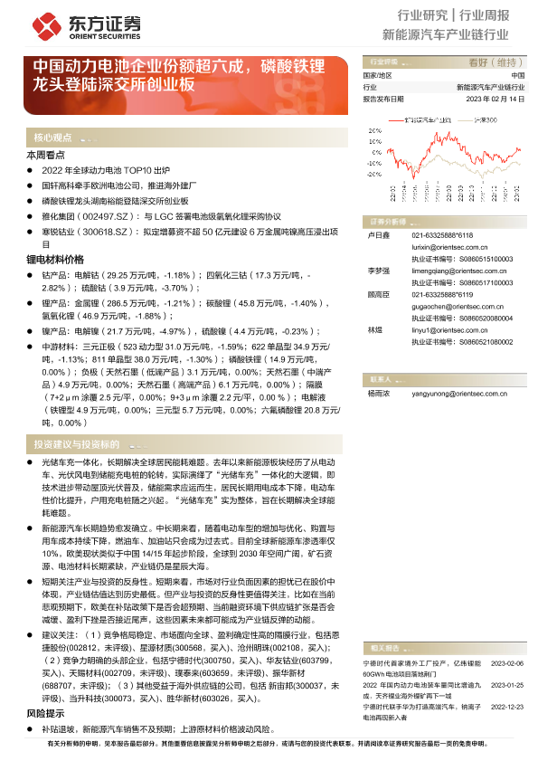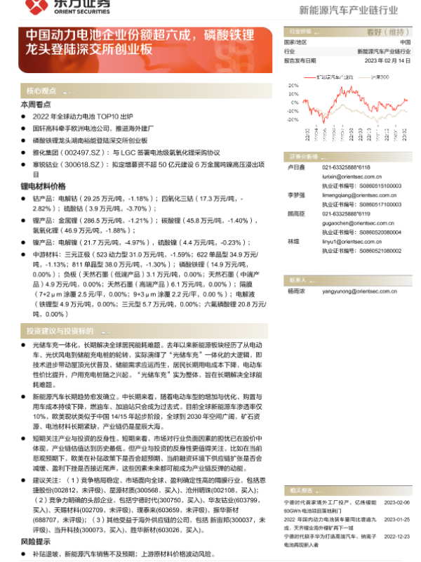 【东方证券】【20230214】20230214-东方证券-新能源汽车产业链行业行业周报:中国动力电池企业份额超六成,磷酸铁锂龙头登陆深交所创业板-15页