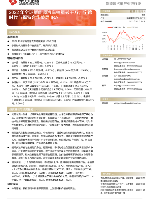 【东方证券】【20230221】20230221-东方证券-新能源汽车产业链行业周报:2022年全球新能源汽车销量破千万,宁德时代与福特合作破局IRA-14页
