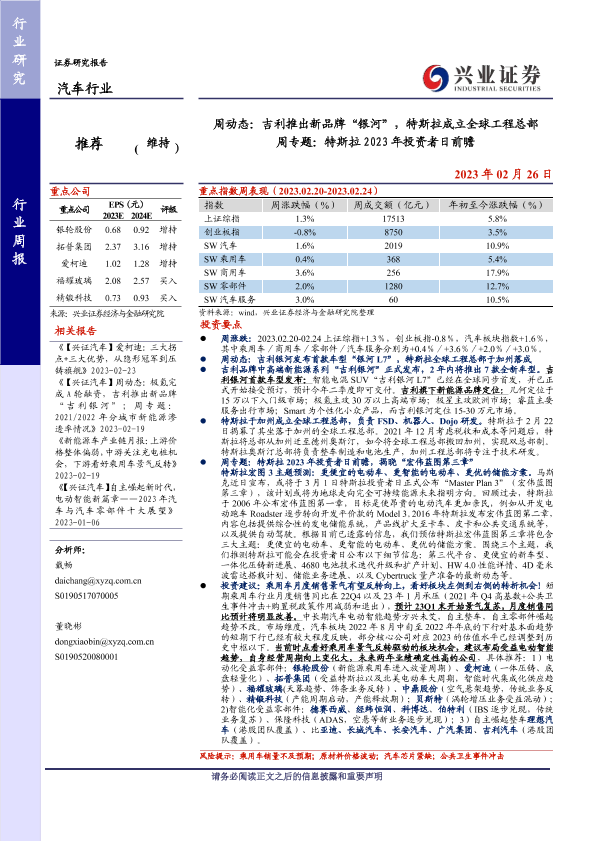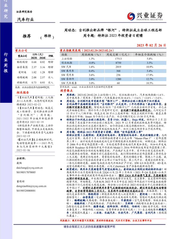 【兴业证券】【20230226】20230226-兴业证券-汽车行业周动态:吉利推出新品牌“银河”,特斯拉成立全球工程总部 周专题:特斯拉2023年投资者日前瞻-31页