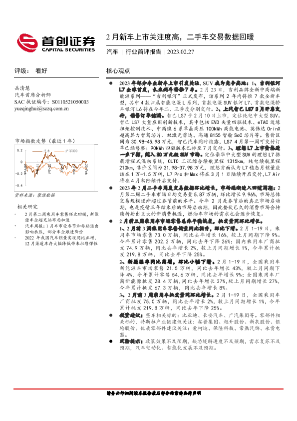 【首创证券】【20230227】20230227-首创证券-汽车行业简评报告:2月新车上市关注度高,二手车交易数据回暖-12页