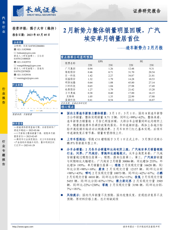 【长城证券】【20230305】20230305-长城证券-造车新势力2月月报:2月新势力整体销量明显回暖,广汽埃安单月销量居首位-12页